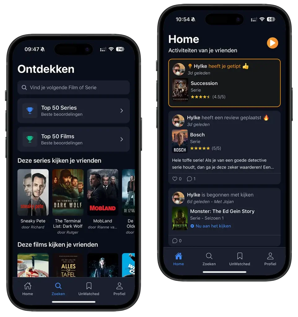 UnWatched combineert het beste van sociale media met de kracht van persoonlijke aanbevelingen. Volg je vrienden, zie wat zij kijken, lees hun eerlijke reviews en bouw je eigen digitale kijkdagboek op. Geen algoritmes die bepalen wat je moet kijken, maar echte mensen met een echte mening.